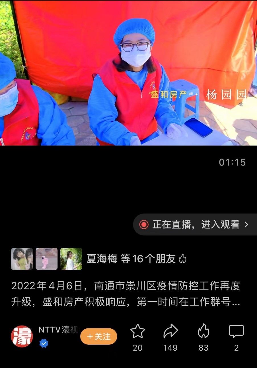 “我們公司72個人,都在社區幫忙做志愿者,也沒有什么特別想說的,就是希望南通疫情快點過去,大家能夠重返以前美好的生活。”這是公司綜合管理部員工楊園園在紅星社區核酸檢測點做志愿服務時接受NTTV采訪所說的話?!獩]有報酬,沒有獎勵,沒有“研究”和“商量”,他們自覺自愿。他們是黨員,是群眾;是領導,是員工;是兒女,是父母;他們是盛和房產志愿者。